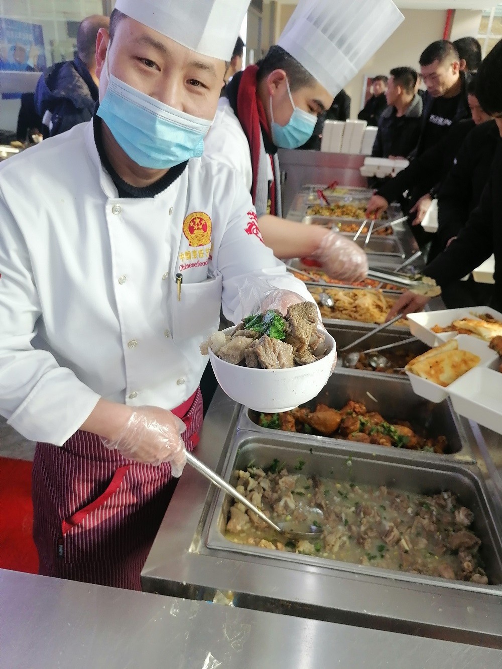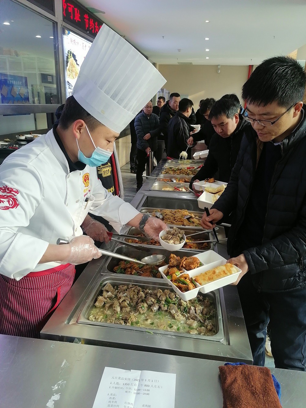 为让大家过上一个幸福的元旦,经公司领导研究决定,元旦当天,为矿区在岗1300多名职工提供免费的节日餐。为此物业公司餐厅班组自12月29日起,在克服天气极为寒冷、餐具不足等困难下,连续奋战14个小时,为矿区的职工兄弟们筹备各种菜品、处理原材料、洗消节日餐具,累计切配羊肉900余斤、猪肉400余斤、鸡腿1200余只、处理各种菜品1000余斤。元旦当天,为职工提供节日餐(午餐+晚餐)共1340份,职工在2021新年的第一天就感受到了公司关怀。